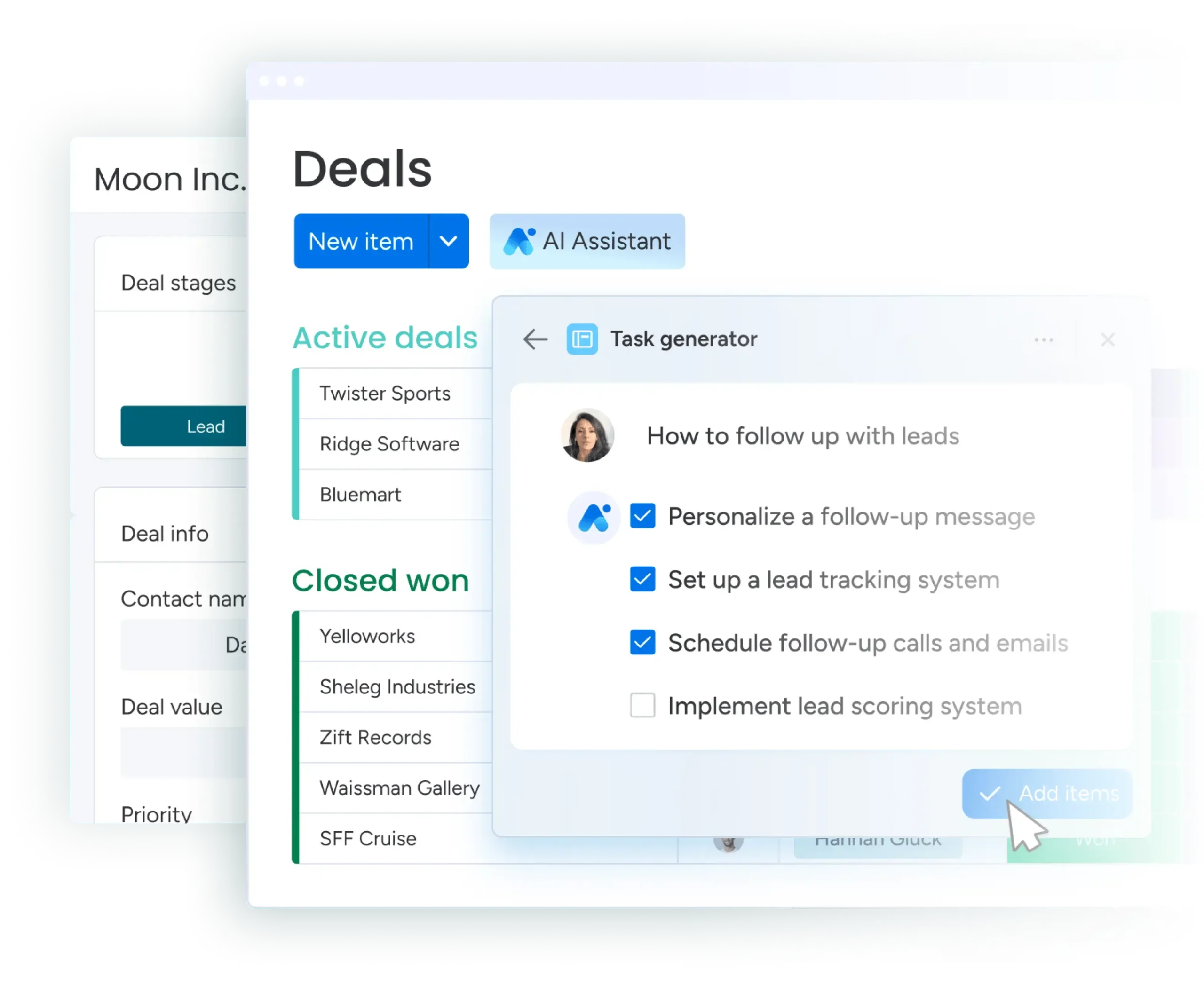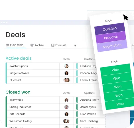 Wij helpen u met het opzetten en configureren van Monday Work OS en CRM om uw bedrijfsprocessen te stroomlijnen en efficiënter te maken.